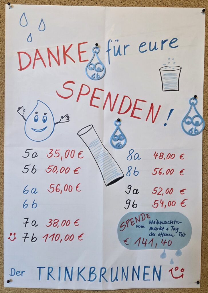 Vor einiger Zeit endete die Sammlung von Spenden zum weiteren Betreiben unseres Wasserautomaten. Leider fallen durch notwendige regelmäßige Wartungsarbeiten hohe Kosten an. Der Förderverein kann diese nicht auf Dauer finanzieren, weshalb die Sammlung in den Klassen ins Leben gerufen wurde. Allen mit dem Einsammeln des Geldes beschäftigten Schülerinnen, Schülern, Eltern und Lehrkräften sei an dieser Stelle ein GANZ GROSSER DANK ausgesprochen.