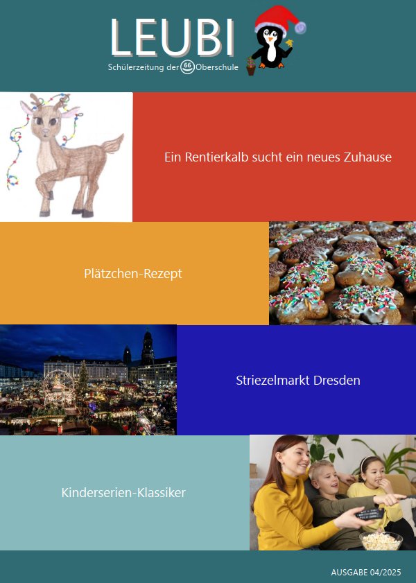 Die aktuelle Ausgabe der Schülerzeitung LEUBI widmet sich ganz dem Thema Winter und Weihnachten. Die Schülerzeitung-AG unter Leitung von Frau Heuschmidt hat für alle interessierten Leser wieder interessante Themen, Geschichten und Rätsel in diese Ausgabe gepackt. Es gibt sicher in den kommenden Weihnachtsferien Gelegenheit zum Lesen und auch Ausprobieren des mitgelieferten Rezepts. Wir wünschen viel Spaß beim Lesen, Schauen und Rätseln!